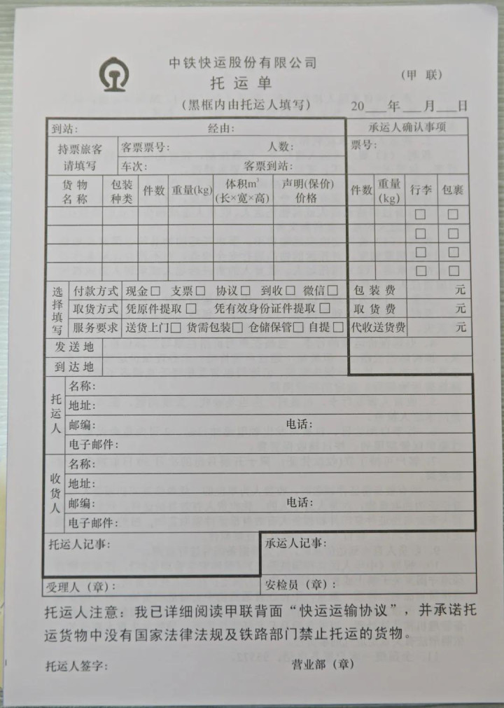 3.向职责主说念主员出示身份证件和已购车票并填写托运单;
