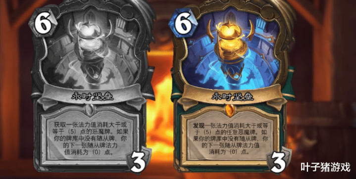 另外“永时坚垒”则改成“发现一张法力值销耗大于或等于(5)点的随心恶魔牌”,比起之前的后果很多了,算得上是法术瞎的一种补强,但“幽默”的本诽谤题依旧没变,懂的王人懂。